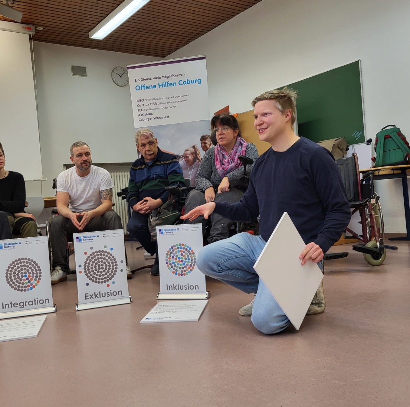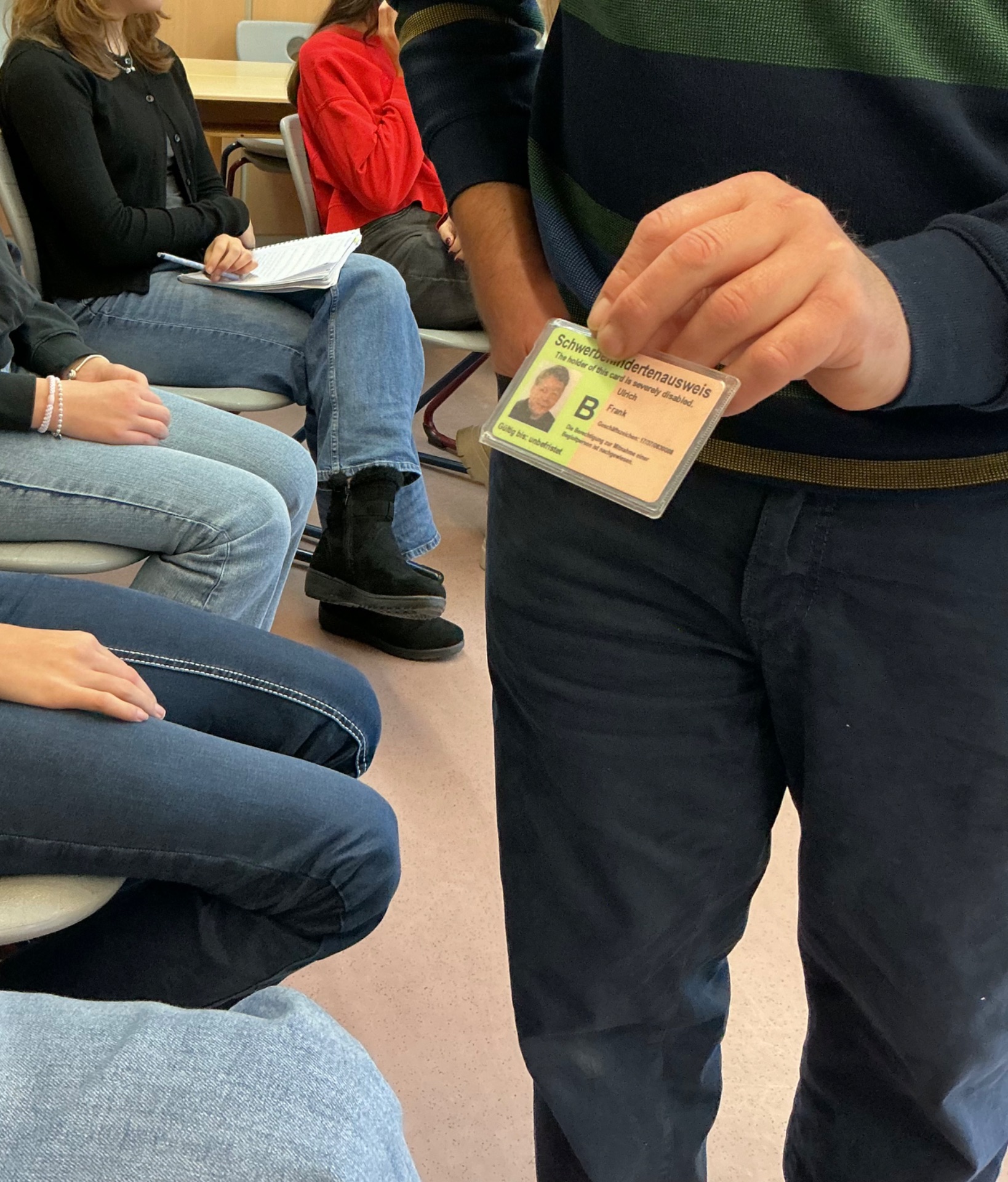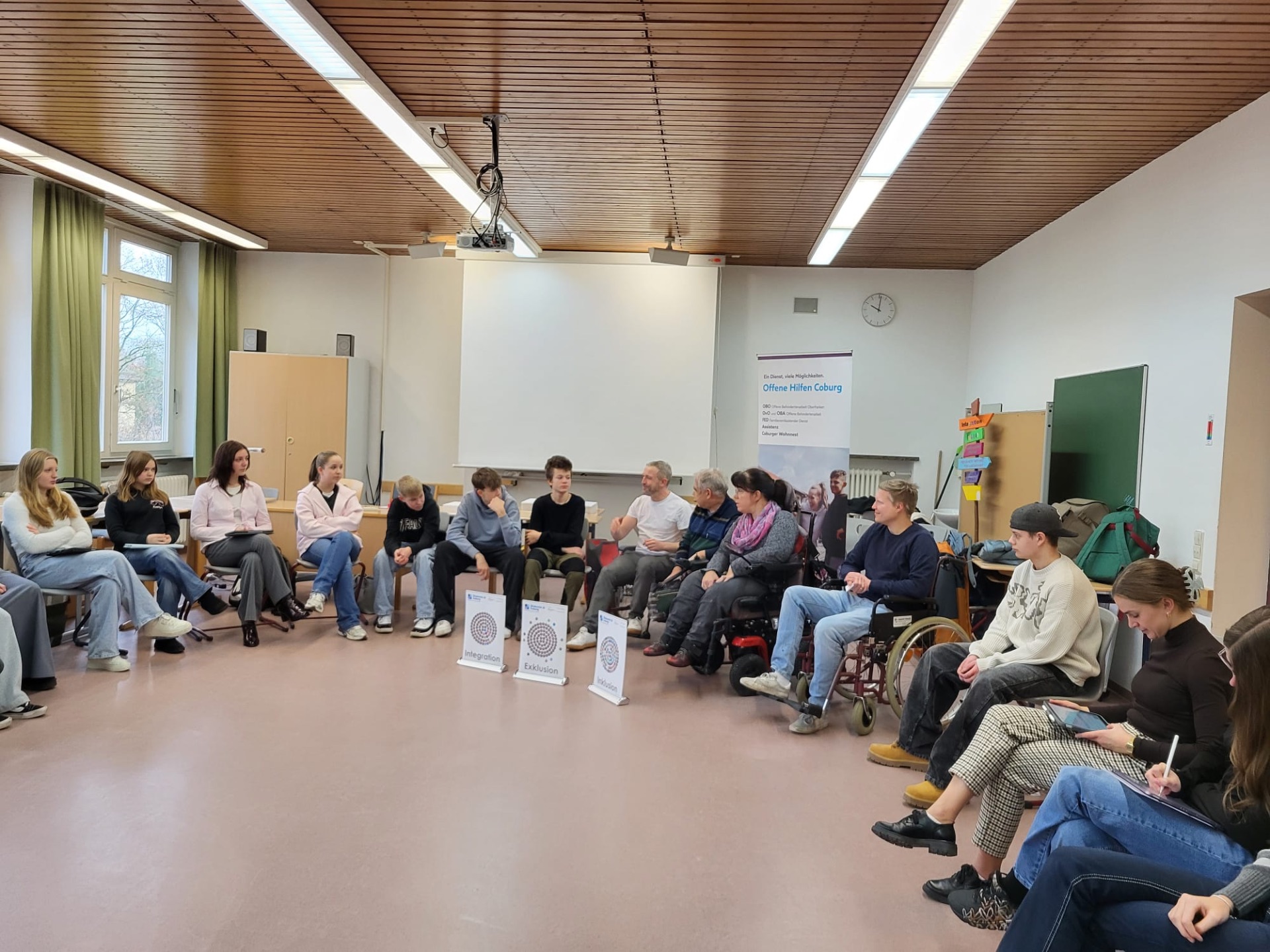 Wie möchten Menschen mit Behinderung selbst bezeichnet werden? Wer legt eigentlich fest, ob jemand „behindert“ ist? Und wie inklusiv ist die Stadt Coburg wirklich? Mit diesen und weiteren Fragen setzten sich die 9. Klassen des sozialwissenschaftlichen Zweigs am 11. Dezember 2025 im Gespräch mit Jessica Augstein und Frank Ulrich auseinander. Beide arbeiten in Werkstätten für Menschen mit Behinderung und berichteten gemeinsam mit Tizian Späth und Sebastian Deringer von der Offenen Behindertenarbeit Coburg aus ihrem Alltag. In zwei Unterrichtsstunden erhielten die Schülerinnen und Schüler die Gelegenheit, aus erster Hand Einblicke in Lebensrealitäten, Barrieren und Möglichkeiten gelingender Teilhabe zu gewinnen.